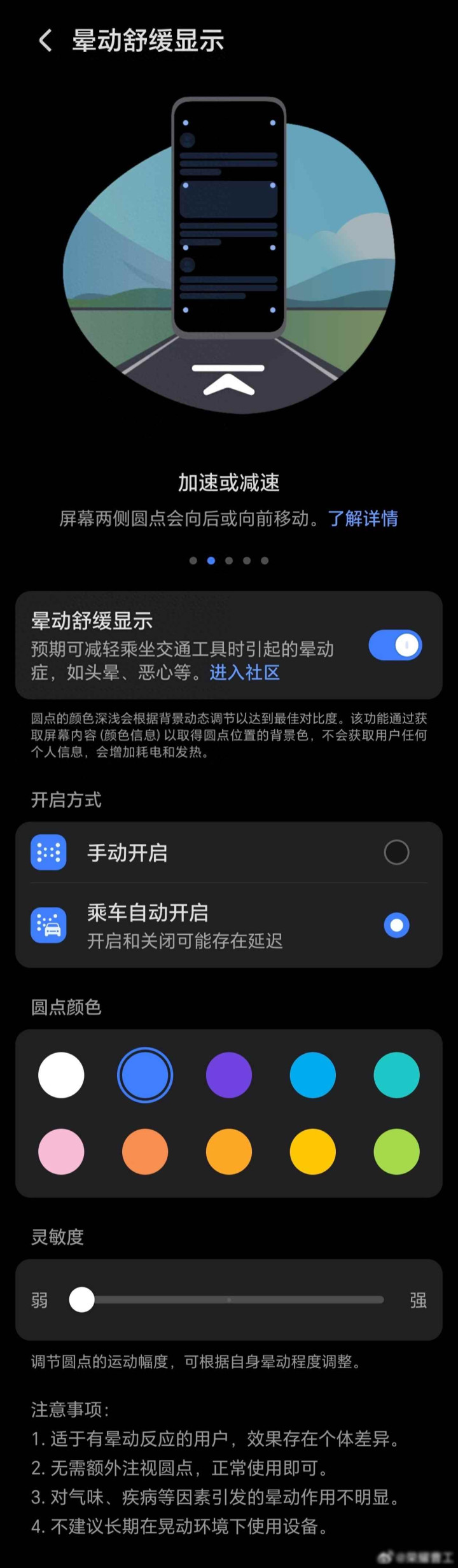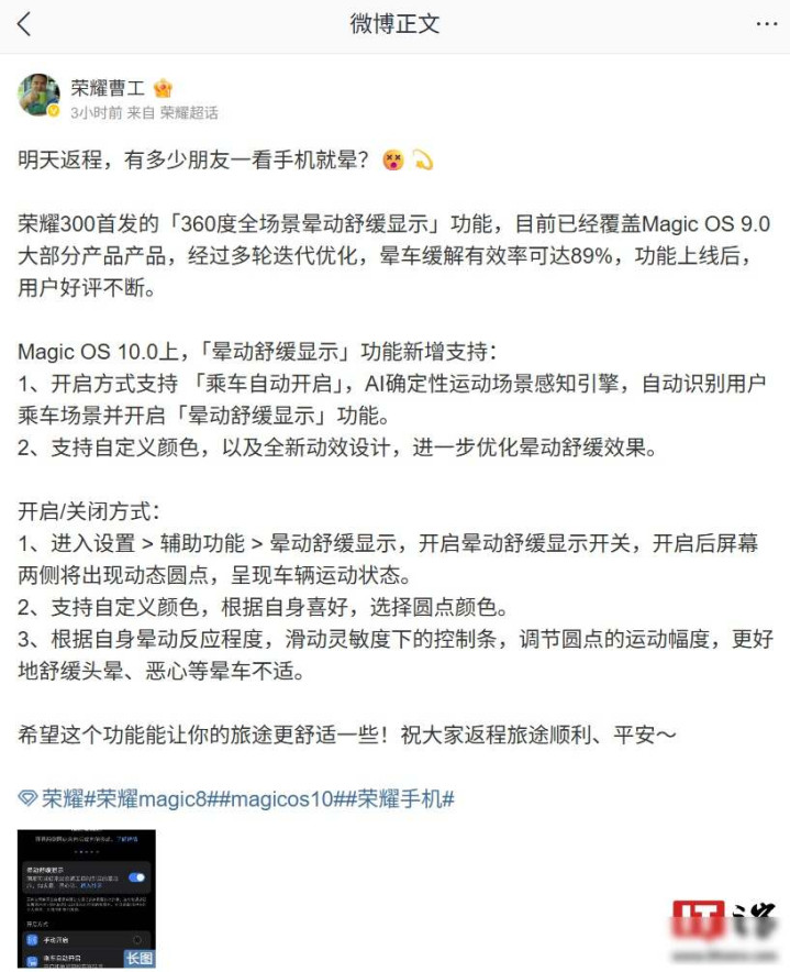 荣耀有个叫曹工的工程师,10月7号提了个新功能,叫晕动舒缓显示,装在MagicOS 10.0系统里,坐车的时候会自动打开,屏幕上加几个小圆点,跟着车子晃,你可以自己调强弱,调得越强越舒服股票配资网站开户,官方说八成九的人用了觉得有用,这不用吃药,就是让眼睛看的东西,帮脑子别乱想。